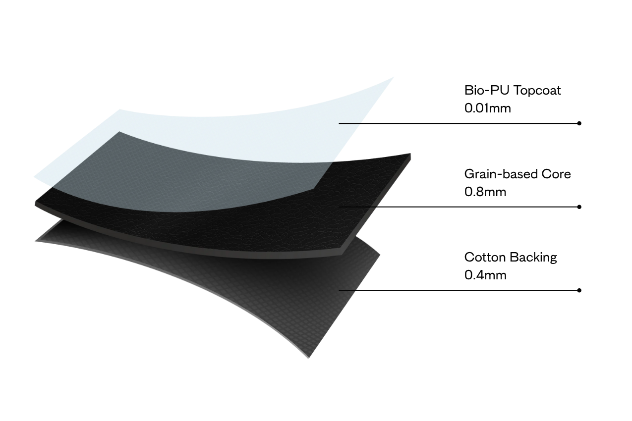 At its core, ELEVATE combines a grain-based layer with a soft organic cotton backing, finished with a thin protective bio-PU coating. The result is a durable, tactile material that holds its shape beautifully.